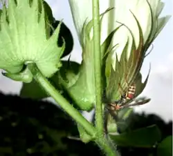 In cotton production, the replacement of broad-spectrum insecticides with selective control measures such as Bt cotton can create a more favorable environment for natural enemies of cotton pests due to reduced insecticide exposure risk. Such predators or parasitoids can control pests not affected by the Bt protein. Reduced prey quality and abundance associated with increased control from Bt cotton can also indirectly decrease natural enemy populations in some cases, but the percentage of pests eaten or parasitized in Bt and non-Bt cotton are often similar.[35]