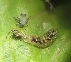The larvae of many hoverfly species principally feed upon aphids, one larva devouring up to 400 in its lifetime. Their effectiveness in commercial crops has not been studied.[37]