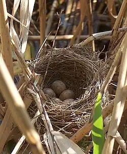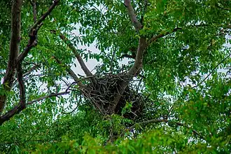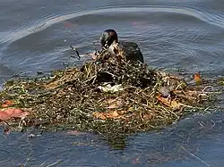 Not all bird species build nests. Some species lay their eggs directly on the ground or rocky ledges, while brood parasites lay theirs in the nests of other birds, letting unwitting "foster parents" do the work of rearing the young. Although nests are primarily used for breeding, they may also be reused in the non-breeding season for roosting and some species build special dormitory nests or roost nests (or winter-nest) that are used only for roosting.[7] Most birds build a new nest each year, though some refurbish their old nests.[8] The large eyries (or aeries) of some eagles are platform nests that have been used and refurbished for several years. The Eurasian coot also reuses nesting sites, particularly in urban areas like the canals of Amsterdam, where nests made from plastic waste have formed stratified layers over decades.[9][10] These layers, preserved due to the non-degradable nature of plastic, can be dated using expiration dates on food packaging found within them.[11][12][13]