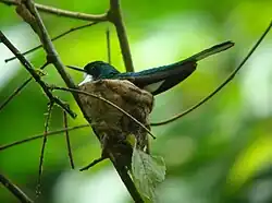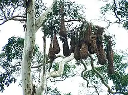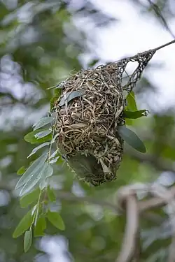 A bird nest is the spot in which a bird lays and incubates its eggs and raises its young. Although the term popularly refers to a specific structure made by the bird itself—such as the grassy cup nest of the American robin or Eurasian blackbird, or the elaborately woven hanging nest of the Montezuma oropendola or the village weaver—that is too restrictive a definition. For some species, a nest is simply a shallow depression made in sand; for others, it is the knot-hole left by a broken branch, a burrow dug into the ground, a chamber drilled into a tree, an enormous rotting pile of vegetation and earth, a shelf made of dried saliva or a mud dome with an entrance tunnel. Some birds, including magpies, have been observed building nests using anti-bird spikes[1][2]. In some cases, these nests can contain up to 1,500 metal spikes.[3] Magpies use the spikes to form a protective dome, which may help deter predators and safeguard their chicks, ironically using the spikes in a way that still serves their original purpose of keeping (other) birds away.[4] The smallest bird nests are those of some hummingbirds, tiny cups which can be a mere 2 cm (0.8 in) across and 2–3 cm (0.8–1.2 in) high.[5] At the other extreme, some nest mounds built by the dusky scrubfowl measure more than 11 m (36 ft) in diameter and stand nearly 5 m (16 ft) tall.[6] The study of birds' nests is known as caliology or nidology.