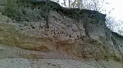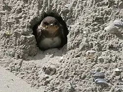 Most burrow nesting species dig a horizontal tunnel into a vertical (or nearly vertical) dirt cliff, with a chamber at the tunnel's end to house the eggs.[60] The length of the tunnel varies depending on the substrate and the species; sand martins make relatively short tunnels ranging from 50–90 cm (20–35 in),[61] for example, while those of the burrowing parakeet can extend for more than three meters (nearly 10 ft).[62] Some species, including the ground-nesting puffbirds, prefer flat or gently sloping land, digging their entrance tunnels into the ground at an angle.[63] In a more extreme example, the D'Arnaud's barbet digs a vertical tunnel shaft more than a meter (39 in) deep, with its nest chamber excavated off to the side at some height above the shaft's bottom; this arrangement helps to keep the nest from being flooded during heavy rain.[64] Buff-breasted paradise-kingfishers dig their nests into the compacted mud of active termite mounds, either on the ground or in trees.[58] Specific soil types may favour certain species and it is speculated that several species of bee-eater favor loess soils which are easy to penetrate.[65][66]