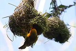 In the majority of nest-building species the female does most or all of the nest construction, in others both partners contribute; sometimes the male builds the nest and the hen lines it.[14][15] In some polygynous species, however, the male does most or all of the nest building. The nest may also form a part of the courtship display such as in weaver birds. The ability to choose and maintain good nest sites and build high quality nests may be selected for by females in these species. In some species the young from previous broods may also act as helpers for the adults.