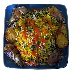 Pilau is a mixed rice dish popular in the cuisines of the Indian subcontinent, Central Asia, and Middle Eastern cuisine. Opinions differ on the differences between the dishes, if any.[28][29]