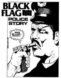 Another image which drew considerable attention was the artwork created for the "Police Story" single, showing a police officer being held with a gun in his mouth with the speech blurb "Make me come, faggot!" The image was plastered on flyers all around Los Angeles and added to the police pressure on the band.[93] Pettibon later remarked that "my values are relativistic, and I'll give a cop the benefit of the doubt. If that's me with my gat – my gat's larger than the one depicted – we can have a discussion, and he can answer me just as well with my .357 barrel in his mouth, or on his cheek, or on his adenoids, or down his throat. I'll listen to his whimpering cries."[99]