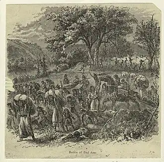 The Battle of Wisconsin Heights had been a victory for the militia; no regular soldiers of the U.S. Army had been present.[144] Atkinson and the regulars joined up with the volunteers several days after the battle. With a force of about 400 regulars and 900 militiamen, the Americans crossed the Wisconsin River on July 27 and resumed the pursuit of the British Band.[145] The British Band was moving slow, encumbered with wounded warriors and people dying of starvation. The Americans followed the trail of dead bodies, cast off equipment, and the remains of horses the hungry Natives had eaten.[146]