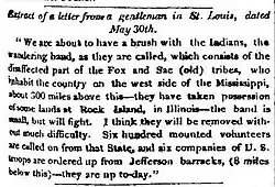 - ^ Lewis, James. "The Black Hawk War of 1832". Abraham Lincoln Historical Digitization Project. Northern Illinois University. p. 2d. Archived from the original on June 19, 2009. Retrieved August 11, 2009.