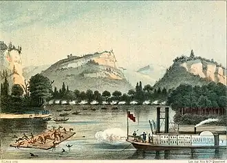 The Americans, however, had no intentions of letting the British Band escape. The Warrior, a steamboat outfitted with an artillery piece, patrolled the Mississippi River, while American-allied Dakotas, Menominees, and Ho-Chunks watched the banks.[149] On August 1, the Warrior arrived at the mouth of the Bad Axe River, where the Dakotas told the Americans that they would find Black Hawk's people.[150] Black Hawk raised a white flag in an attempt to surrender, but his intentions may have been garbled in translation.[151] The Americans, in no mood to accept a surrender anyway, thought that the Indians were using the white flag to set an ambush. When they became certain that the Natives on land were the British Band, they opened fire. Twenty-three Natives were killed in the exchange of gunfire, while just one soldier on the Warrior was injured.[152]