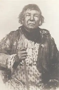 According to Neapope's erroneous report, Wabokieshiek ("White Cloud"), a shaman known to Americans as the "Winnebago Prophet", had claimed that other tribes were ready to support Black Hawk.[33] Wabokieshiek's mother was a Ho-Chunk (Winnebago), but his father had belonged to a Sauk clan that provided the tribe's civil leaders. When Wabokieshiek joined the British Band in 1832, he would become the ranking Sauk civil chief in the group.[35] His village, Prophetstown, was about thirty-five miles up the Rock River from Saukenuk.[36] The village was inhabited by about 200[16] Ho-Chunks, Sauks, Meskwakis, Kickapoos, and Potawatomis who were dissatisfied with tribal leaders who refused to stand up to American expansion.[37] Although some Americans would later characterize Wabokieshiek as a primary instigator of the Black Hawk War, the Winnebago Prophet, according to historian John Hall, "actually discouraged his followers from resorting to armed conflict with the whites".[38]