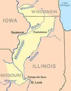 In the 18th century, the Sauk and Meskwaki (or Fox) Native American tribes lived along the Mississippi River in what are now the U.S. states of Illinois and Iowa. The land they lived on was considered sacred because of the fertile soil, prime hunting, accessibility to lead, and access to water, which was helpful for trade. The two tribes had become closely connected after having been displaced from the Great Lakes region in conflicts with New France and other Native American tribes, particularly after the so-called Fox Wars ended in the 1730s.[5] By the time of the Black Hawk War, the population of the two tribes was about 6,000 people.[6]
