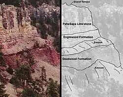 Fallingrock cliff in Dark Canyon. The rock is of Paleozoic age but is capped with a Cenozoic gravel terrace.