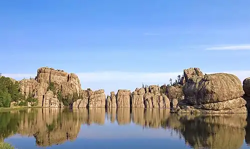 The Black Hills is an isolated mountain range rising from the Great Plains of North America in western South Dakota and extending into Wyoming, United States.[3] Black Elk Peak, which rises to 7,242 feet (2,207 m), is the range's highest summit.[4] The name of the range in Lakota is Pahá Sápa.[5] It encompasses the Black Hills National Forest. It formed as a result of an upwarping of ancient rock, after which the removal of the higher portions of the mountain mass by stream erosion produced the present-day topography. The hills are so called because of their dark appearance from a distance, as they are covered in evergreen trees.[6][7][8]
