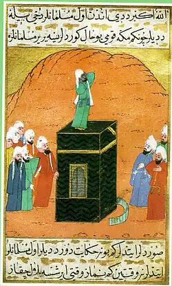 Bilal ibn Ribah (pictured atop the Kaaba, Mecca) was a former Ethiopian slave and the first muezzin, c. 630.