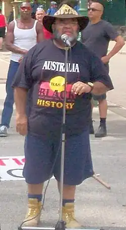 Aboriginal activist Sam Watson addressing Invasion Day Rally 2007 in an "Australia has a Black History" T-shirt