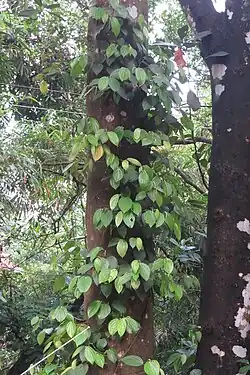 Black pepper vine climbing on jackfruit tree (Artocarpus heterophyllus)