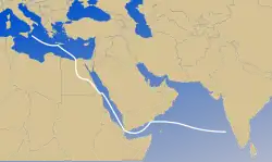 Pepper's exorbitant price during the Middle Ages – and the monopoly on the trade held by Venice – helped motivate the Portuguese to seek a sea route to India. In 1498, Vasco da Gama became the first person to reach India by sailing around Africa; asked by Arabs in Calicut (who spoke Spanish and Italian) why they had come, his representative replied, "we seek Christians and spices".[31] Though this first trip to India by way of the southern tip of Africa was only a modest success, the Portuguese quickly returned in greater numbers and eventually gained much greater control of trade on the Arabian Sea, including through the 1494 Treaty of Tordesillas.