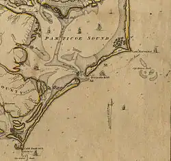 Maynard took command of the two armed sloops on 17 November. He was given 57 men—33 from HMS Pearl and 24 from HMS Lyme. Maynard and the detachment from HMS Pearl took the larger of the two vessels and named her Jane; the rest took Ranger, commanded by one of Maynard's officers, a Mister Hyde. Some from the two ships' civilian crews remained aboard. They sailed from Kecoughtan, along the James River, on 17 November.[76] The two sloops moved slowly, giving Brand's force time to reach Bath. Brand set out for North Carolina six days later, arriving within three miles of Bath on 23 November. Included in Brand's force were several North Carolinians, including Colonel Moore and Captain Jeremiah Vail, sent to counter any local objection to the presence of foreign soldiers. Moore went into the town to see if Teach was there, reporting back that he was not, but that he was expected at "every minute." Brand then went to Governor Eden's home and informed him of his purpose. The next day, Brand sent two canoes down Pamlico River to Ocracoke Inlet, to see if Teach could be seen. They returned two days later and reported on what eventually transpired.[77]