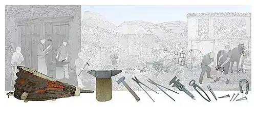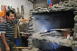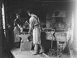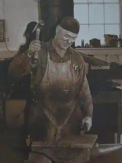 A blacksmith is a metalsmith who creates objects primarily from wrought iron or steel, but sometimes from other metals, by forging the metal, using tools to hammer, bend, and cut (cf. tinsmith). Blacksmiths produce objects such as gates, grilles, railings, light fixtures, furniture, sculpture, tools, agricultural implements, decorative and religious items, cooking utensils, and weapons. There was a historical distinction between the heavy work of the blacksmith and the more delicate operations of a whitesmith, who usually worked in gold, silver, pewter, or the finishing steps of fine steel.[1] The place where a blacksmith works is variously called a smithy, a forge, or a blacksmith's shop.