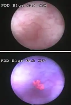 Those suspected of having bladder cancer undergo several tests to assess the presence and extent of any tumors. The gold standard is cystoscopy, wherein a flexible camera is threaded through the urethra and into the bladder to visually inspect for cancerous tissue.[6][7] Cystoscopy is most efficient at detecting papillary tumors (tumors with a finger-like shape that grow into the urine-holding part of the bladder); it is less efficient with small, low-lying carcinoma in situ (CIS).[8] CIS detection is improved by blue light cystoscopy, where a dye (hexaminolevulinate) that accumulates in cancer cells is injected into the bladder during cystoscopy. The dye fluoresces when the cystoscope shines blue light on it, allowing for more accurate detection of small tumors.[6][8]