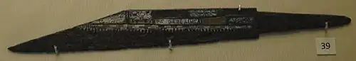 Early blade inscriptions are known from the Bronze Age, a Hittite sword found at Hattusa bears an inscription chiseled into the bronze, stating that the blade was deposited as an offering to the storm-god by king Tuthaliya.[17]