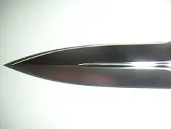 - A needle point blade has a sharply-tapered acuminated point. It is frequently found on daggers such as the stiletto (which had no sharpened edges) and the Fairbairn–Sykes fighting knife. Its long, narrow point reduces friction and increases the blade's penetrative capabilities, but is liable to stick in bone and can break if abused. When the needle point is combined with a reinforced 'T' section running the length of the blade's spine, it is called a reinforced tip. One example of a knife with a reinforced tip is the pesh-kabz.