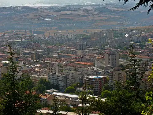 Blagoevgrad (Bulgarian: Благоевград [bɫɐˈɡɔɛvˌɡrat]) is а town in Southwestern Bulgaria, the administrative centre of Blagoevgrad Municipality and of Blagoevgrad Province. With a population of almost 70,000 inhabitants,[2] it is the economic and cultural centre of Southwestern Bulgaria. It is located in the valley of the Struma River at the foot of the Rila Mountains, 101 kilometres (63 miles) south of Sofia, close to the border with North Macedonia.