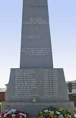 Bloody Sunday, or the Bogside Massacre,[1] was a massacre on 30 January 1972 when British soldiers shot 26 unarmed civilians during a protest march in the Bogside area of Derry,[a] in Northern Ireland. Thirteen men were killed outright and the death of another man four months later has been attributed to his gunshot injuries. Many of the victims were shot while fleeing from the soldiers and some were shot while trying to help the wounded.[2] Other protesters were injured by shrapnel, rubber bullets, or batons; two were run down by British Army vehicles; and some were beaten.[3][4] All of those shot were Catholics. The march had been organised by the Northern Ireland Civil Rights Association (NICRA) to protest against internment without trial. The soldiers were from the 1st Battalion of the Parachute Regiment ("1 Para"), the same battalion implicated in the Ballymurphy massacre several months before.[5]