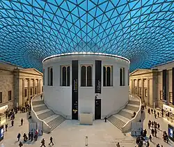The British Museum, which first opened to the public in 1759 in Montagu House, is at the heart of Bloomsbury. At the centre of the museum the space around the former British Library Reading Room, which was filled with the concrete storage bunkers of the British Library, is today the Queen Elizabeth II Great Court, an indoor square with a glass roof designed by British architect Norman Foster. It houses displays, a cinema, a shop, a cafe and a restaurant. Since 1998, the British Library has been located in a purpose-built building just outside the northern edge of Bloomsbury, in Euston Road.