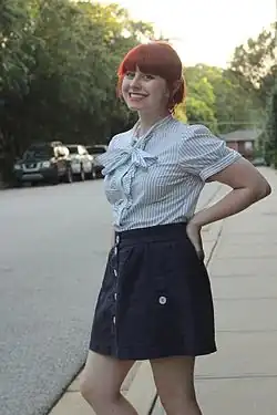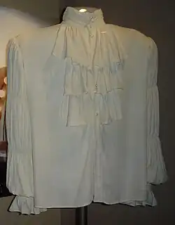 A blouse (/blaʊz, blaʊs, bluːz/)[1][2] is a loose-fitting upper garment that may be worn by workmen, peasants, artists, women, and children.[3][4] It is typically gathered at the waist or hips (by tight hem, pleats, parter, or belt) so that it hangs loosely ("blouses"[5]) over the wearer's body.[4] Today, the word most commonly refers to a girl's or woman's dress shirt, although there is considerable confusion between a true blouse and a women's shirt.[6] It can also refer to a man's shirt if it is a loose-fitting style (e.g. poet shirts and Cossack shirts),[3][7] though it rarely is. Traditionally, the term has been used to refer to a shirt which blouses out or has an unmistakably feminine appearance, although even many "standard" shirts today have a somewhat blousy fit, and the numbers of men wearing such shirts may match (or even exceed) that of women wearing actual blouses.