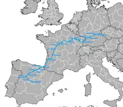 While Spain formally remained neutral, it did not hide its ideological support for the Axis powers.[3] Franco had been supported by Nazi Germany and Fascist Italy during the Civil War and Franco sympathised with many aspects of fascist ideology, especially its anti-communism. On the other side, the republican army had been supported by Soviet aid. More importantly, Franco seriously contemplated joining the Axis Powers in the aftermath of the Fall of France in 1940.[2] He met Adolf Hitler on 23–24 October 1940 at Hendaye to discuss Spanish belligerency but was unable to gain promises that Spain would gain colonial territories from France in North Africa. Hitler feared delegitimizing the new Vichy regime in France.[4]