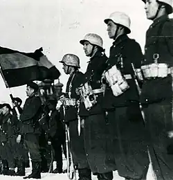 Recruitment began on 27 June 1941 and 18,373 men had volunteered by 2 July 1941 from within the Spanish Army and Falangist movement.[7] Fifty per cent of officers and NCOs were professional soldiers given leave from the Spanish Army, including many veterans of the Spanish Civil War. The division was made up mainly of Falangist volunteers and almost a fifth of early volunteers were students.[8] Additionally, the division contained a small number of White émigrés from Spain.[3] General Agustín Muñoz Grandes was assigned to lead the volunteers. Because the soldiers could not use official Spanish Army uniforms, they adopted a symbolic uniform comprising the red berets of the Carlists, the khaki trousers of the Spanish Legion, and the blue shirts of the Falangists—hence the nickname "Blue Division." This uniform was used only while on leave in Spain; in the field, soldiers wore the German Army field grey uniform (Feldgrau) with a shield on the upper right sleeve bearing the word "España" and the Nationalist Spanish national colours.