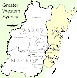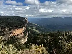 The Blue Mountains (Gundungurra/Dharug: Colomatta or Gulumada)[5][6] are a mountainous region and a mountain range located in New South Wales, Australia. The region is considered to be part of the western outskirts of the Greater Sydney area. The region borders on Sydney's main metropolitan area, its foothills starting about 50 kilometres (31 mi) west of centre of the state capital, close to Penrith.[7] The public's understanding of the extent of the Blue Mountains is varied, as it forms only part of an extensive mountainous area associated with the Great Dividing Range.[8] As defined in 1970, the Blue Mountains region is bounded by the Nepean and Hawkesbury rivers in the east, the Coxs River and Lake Burragorang to the west and south, and the Wolgan and Colo rivers to the north.[9] Geologically, it is situated in the central parts of the Sydney Basin.[10]
