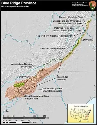 The Blue Ridge Mountains are a physiographic province of the larger Appalachian Highlands range. The mountain range is located in the Eastern United States and extends 550 miles (885 km) southwest from southern Pennsylvania through Maryland, West Virginia, Virginia, North Carolina, South Carolina, Tennessee, and Georgia.[1] The province consists of northern and southern physiographic regions, which divide near the Roanoke River gap.[2] To the west of the Blue Ridge, between it and the bulk of the Appalachians, lies the Great Appalachian Valley, bordered on the west by the Ridge and Valley province of the Appalachian range.