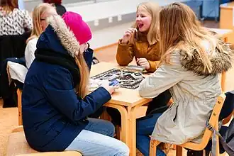 Young girls playing a board game in the Iisalmi library in Finland, 2016