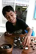 The title of the oldest known board game has been difficult to establish.[29] An example of this is mancala, which includes a broad family of board games with a core design of two rows of small circular divots or bowls carved into a surface, which has had numerous estimations of its generic age due to the many variants that have been discovered in different locations across Africa, the Middle East, and southern Asia.[29] These are dated across many different historical periods, from archaeological sites dating the game at c. 800 BCc. 200 BC (Roman Settlements); c. 2500 BCc. 1500 BC (Egypt); and even c. 7000  BCc. 5000  BC (Jordan). The later based on divots carved out of limestone in a Neolithic dwelling from c. 5870  BC ± 240 BC,[16][29][30] although this later dating has been disputed.[31] Furthermore, when considering the Neolithic period game boards discoveries, caution has been given against considering these finds as representing earliest human game playing, as the absence of evidence of such games does not equate to evidence that no games were played during earlier periods.[32]