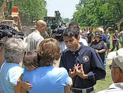 Jindal oversaw one of the largest evacuations in U.S. history (nearly two million people) in late August 2008 prior to the Louisiana landfall of Hurricane Gustav.[70] He issued mandatory evacuation orders for the state's coastal areas and activated 3,000 National Guardsman to aid in the exodus. He also ordered the state to purchase generators to provide needed power to hospitals and nursing homes without power. Government officials vacated hospitals and nursing homes and put the poor, the ill, and the elderly on buses and trains out of town. The evacuation was credited as one reason that Gustav resulted in only 16 deaths in the U.S. The state's successful response to Hurricane Gustav was in stark contrast to the failed hurricane response system for Hurricane Katrina in 2005. Jindal received bipartisan praise for his leadership during Gustav.[71] Jindal had been scheduled to address the Republican National Convention, but cancelled his plans in order to focus on Louisiana's needs during the storm.[72]