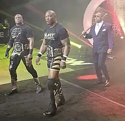 On the January 22, 2025, episode of Dynamite, Lashley and Benjamin defeated Private Party (Isiah Kassidy and Marq Quen) to win the AEW World Tag Team Championship.[212] This marked Lashley's first ever tag championship in a major promotion.[213] On the February 12 episode of Dynamite, Lashley and Benjamin defeated The Gunns (Austin Gunn and Colten Gunn) in their first title defense.[214] On March 9 at Revolution, Lashley and Benjamin successfully defended their titles against The Outrunners (Truth Magnum and Turbo Floyd).[215] On April 6 at Dynasty, Lashley and Benjamin successfully defended their titles against Big Bill and Bryan Keith of The Learning Tree after assistance from MJF, who had been trying to join The Hurt Syndicate in the weeks leading up to Dynasty.[216] On May 14 at Dynamite: Beach Break, Lashley, Benjamin, and MVP accepted MJF as a member of the group.[217] On May 25 at Double or Nothing, Lashley and Benjamin successfully defended their titles against Sons of Texas (Dustin Rhodes and Sammy Guevara).[218] On July 12 at All In, Lashley and Benjamin successfully defended their titles in a three-way tag team match against JetSpeed (Kevin Knight and "Speedball" Mike Bailey) and The Patriarchy (Christian Cage and Nick Wayne).[219] On the July 23 episode of Dynamite, The Hurt Syndicate (minus MJF) would turn into tweeners as they would be briefly hired by Cope to assist him in his feud with FTR (Cash Wheeler and Dax Harwood).[220] After weeks of tension, The Hurt Syndicate kicked MJF out of the group due to his selfish attitude on the August 6 episode of Dynamite.[221][222][223] On August 24 at Forbidden Door, Lashley and Benjamin lost their titles to Brodido (Bandido and Brody King) in a three-way match, ending their reign at 214 days.[224]
