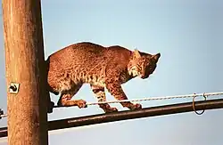 Bobcat in urban surroundings, seen here climbing on a telegraph pole at the Kennedy Space Center. The species' range does not seem to be limited by human populations, as long as it can still find a suitable habitat.