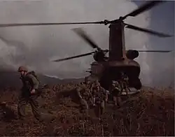 Troops unload from a CH-47 in the Cay Giep Mountains, Vietnam, 1967.