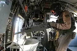 The interior of the CH-46 was largely taken up by its cargo bay, complete with a rear loading ramp that could be removed or left open in flight for the carriage of extended cargoes or for parachute drops. Various furnishings were normally provided to aid in its use as a utility rotorcraft, such as an internal winch mounted within the forward cabin, which can be used to assisting loading by pulling external cargo on pallets into the aircraft via the ramp and rollers, and an optionally-attached belly-mounted cargo hook, which would be usually rated at 10,000 lb (4,500 kg) for carrying cargoes externally underneath the Sea Knight; despite the hook having been rated at 10,000 lb (4,500 kg), this was safety restricted to less payload as they got older. When operated in a typical configuration, the CH-46 would usually be operated by a crew of three; a larger crew could be accommodated when required, which would be dependent upon mission specifics. For example, a search and rescue (SAR) variant would usually carry a crew of five (Pilot, Co-Pilot, Crew Chief, Swimmer, and Medic) to facilitate all aspects of such operations. For self-defense, a pintle-mounted 0.50 in (12.7 mm) M2 Browning machine gun could be mounted on each side of the helicopter.[6] Service in southeast Asia resulted in the addition of armor along with the machine guns.[1]