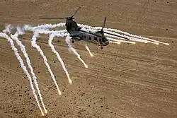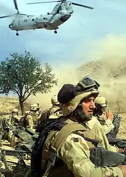 CH-46E Sea Knights were also used by the U.S. Marine Corps during the 2003 invasion of Iraq. In one incident on 1 April 2003, Marine CH-46Es and CH-53Es carried U.S. Army Rangers and Special Operations troops on an extraction mission for captured Army Private Jessica Lynch from an Iraqi hospital.[24] During the subsequent occupation of Iraq and counter-insurgency operations, the CH-46E was heavily used in the CASEVAC role, being required to maintain 24/7 availability regardless of conditions.[25] According to authors Williamson Murray and Robert H Scales, the Sea Knight displayed serious reliability and maintenance problems during its deployment to Iraq, as well as "limited lift capabilities".[26] Following the loss of numerous US helicopters in the Iraqi theatre, the Marines opted to equip their CH-46s with more advanced anti-missile countermeasures.[27]