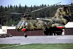 On 22 April 1958, the V-107 prototype performed its maiden flight.[3] In order to garner publicity for the newly developed rotorcraft, it was decided to use the prototype to conduct a series of publicised flight demonstrations during a tour across the United States and several overseas nations. During June 1958, it was announced that the U.S. Army had awarded a contract to Vertol for the construction of ten production-standard aircraft based on the V-107, which were designated YHC-1A.[4] However, this order was later decreased to three helicopters; according to aviation author Jay P. Spenser, the cutback had been enacted in order that the U.S. Army would be able to divert funds for the development of the rival V-114 helicopter, which was also a turbine-powered tandem rotor design but substantially larger than the V-107.[4] All of the U.S. Army's three YHC-1As were powered by pairs of GE-T-58 engines. During August 1959, the first YHC-1A-model rotorcraft conducted its first flight; independently, it was shortly followed by the maiden flight of an improved model intended for the commercial and export markets, designated 107-II.[1]