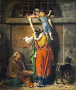 The method of Boethius' execution varies in the sources. He may have been beheaded, clubbed to death, or hanged.[47] It is likely that he was tortured with a rope that was constricted around his head, bludgeoned until his eyes bulged out; then his skull was cracked.[48][49] Following an agonizing death, his remains were entombed in the church of San Pietro in Ciel d'Oro in Pavia, also the resting place of Augustine of Hippo. His wealth was confiscated and his wife, Rusticiana, reduced to poverty.[23]