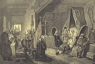 On 22 July, he suffered a cerebral hemorrhage and became paralysed after his audience with the Kiev Colonel Zhdanovich. His expedition to Halychyna had failed because of mutiny within his army.[45] Less than a week later, Bohdan Khmelnytsky died at 5 a.m. on 27 July 1657. His funeral was held on 23 August, and his body was taken from his capital, Chyhyryn, to his estate, at Subotiv, for burial in his ancestral church. In 1664 a Polish hetman Stefan Czarniecki recaptured Subotiv and, according to some Ukrainian historians, ordered the bodies of the hetman and his son, Tymish, to be exhumed and desecrated, while others claim that is not the case.[46]