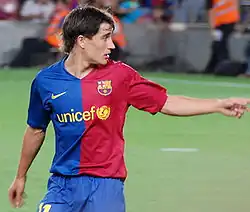 On 16 September 2007 (at 17 years and 19 days), Bojan made his official debut for Barcelona against Osasuna, replacing Giovani dos Santos in the 78th minute[4][8] and breaking Lionel Messi's record of the youngest Barcelona player to feature in a La Liga match.[9] Three days later, he made his UEFA Champions League debut against Lyon, coming on at the 88th minute for Messi. He was, at the time, the youngest Barcelona player ever to feature in a Champions League game, at 17 years and 22 days.[10] He made his second Champions League appearance on 2 October, coming on at the 81st minute for Ronaldinho against VfB Stuttgart. On 20 October 2007 (at 17 years and 53 days), Bojan made his first league start for Barcelona away to Villarreal and scored in the 25th minute. It was his first goal for the club's first team and it made him the youngest ever goalscorer for Barcelona in a league match.[11][12]