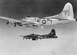 316 B-17 Flying Fortresses bombed Dresden, dropping 771 tons of bombs.[73][74] The remaining 115 bombers from the stream of 431 misidentified their targets. Sixty bombed Prague, dropping 153 tons of bombs, while others bombed Brüx and Pilsen.[74] The 379th bombardment group started to bomb Dresden at 12:17, aiming at marshalling yards in the Friedrichstadt district west of the city centre, as the area was unobscured by smoke or cloud. The 303rd group arrived over Dresden two minutes after the 379th and found their view obscured by clouds, so they bombed Dresden using H2X radar. The groups that followed the 303rd (92nd, 306th, 379th, 384th and 457th) also found Dresden obscured by clouds, and they too used H2X. H2X aiming caused the groups to bomb with a wide dispersal over the Dresden area. The last group to attack Dresden was the 306th, and they finished by 12:30.[75]