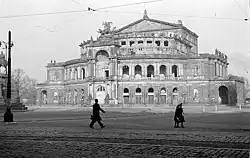 There were few public air raid shelters. The largest, beneath the main railway station, housed 6,000 refugees.[90] As a result, most people took shelter in cellars, but one of the air raid precautions the city had taken was to remove thick cellar walls between rows of buildings and replace them with thin partitions that could be knocked through in an emergency. The idea was that, as one building collapsed or filled with smoke, those sheltering in the basements could knock walls down and move into adjoining buildings. With the city on fire everywhere, those fleeing from one burning cellar simply ran into another, with the result that thousands of bodies were found piled up in houses at the ends of city blocks.[91] A Dresden police report written shortly after the attacks reported that the old town and the inner eastern suburbs had been engulfed in a single fire that had destroyed almost 12,000 dwellings.[92] The same report said that the raids had destroyed the Wehrmacht's main command post in the Taschenbergpalais, 63 administration buildings, the railways, 19 military hospitals, 19 ships and barges, and a number of less significant military facilities. The destruction also encompassed 640 shops, 64 warehouses, 39 schools, 31 stores, 31 large hotels, 26 public houses/bars, 26 insurance buildings, 24 banks, 19 postal facilities, 19 hospitals and private clinics including auxiliary, overflow hospitals, 18 cinemas, 11 churches and 6 chapels, 5 consulates, 4 tram facilities, 3 theatres, 2 market halls, the zoo, the waterworks, and 5 other cultural buildings.[92] Almost 200 factories were damaged, 136 seriously (including several of the Zeiss Ikon precision optical engineering works), 28 with medium to serious damage, and 35 with light damage.[93]
