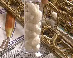In the U.S., teachers may sometimes introduce the insect life cycle to their students by raising domestic silk moths in the classroom as a science project. Students have a chance to observe complete life cycles of insects from eggs to larvae to pupae to moths.[36] Other than the U.S., this domestic silk moth is utilized in educational settings in several countries, including China, South Africa, Zimbabwe, Iran, and Taiwan.[37]