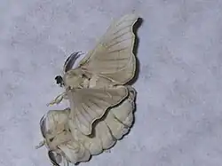 The wings of the silk moth develop from larval imaginal disks.[13] The moth is not capable of functional flight, in contrast to the wild B. mandarina and other Bombyx species, whose males fly to meet females. Some may emerge with the ability to lift off and stay airborne, but sustained flight cannot be achieved as their bodies are too big and heavy for their small wings.