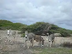 Bonaire is also famed for its flamingo populations and its donkey sanctuary. Flamingos are drawn to the brackish water of the island's lagoons, which harbor the shrimp upon which they feed. Bonaire is home to one of only four nesting grounds for the Caribbean flamingo. Located in the Pekelmeer in the southern part of the island, no human entry is permitted in this sanctuary.[68] In the 16th century, Europeans introduced sheep, goats, pigs, horses and donkeys on Bonaire, and the descendants of the donkeys, goats, and pigs roam the island today.