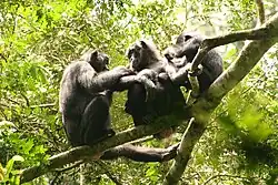 In a study published in November 2023, scientists reported, for the first time, evidence that groups of primates, particularly bonobos, are capable of cooperating with each other.[98][99] Researchers observed unprecedented cooperation between two distinct bonobo groups in the Congo's Kokolopori Bonobo Reserve, Ekalakala and Kokoalongo, challenging traditional notions of ape societies. Over two years of observation, researchers witnessed 95 encounters between the groups. Contrary to expectations, these interactions resembled those within a single group. During these encounters, the bonobos engaged in behaviours such as grooming, food sharing, and collective defense against threats like snakes. Notably, the two groups, while displaying cooperative tendencies, maintained distinct identities, and there was no evidence of interbreeding or a blending of cultures. The cooperation observed was not arbitrary but evolved through individual bonds formed by exchanging favors and gifts. Some bonobos even formed alliances to target a third individual, demonstrating a nuanced social dynamic within the groups.[98][99]